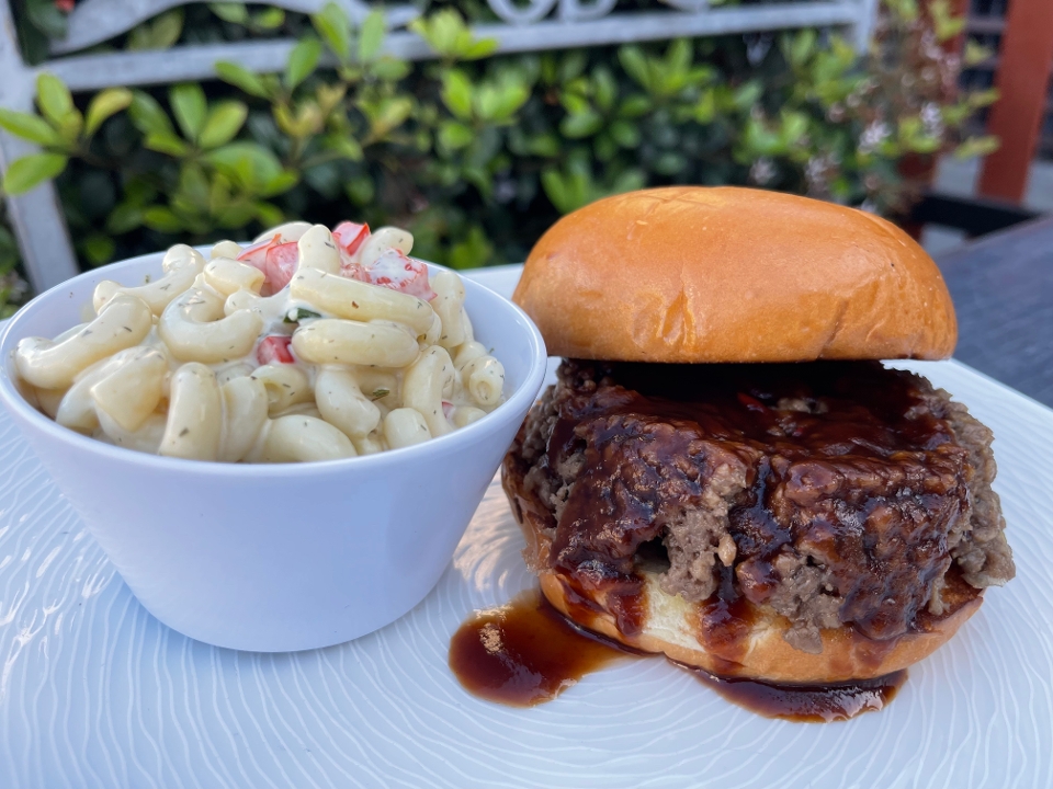 Plant based impossible meat seasoned & smoked with onion & bell pepper served with choice of bbq sauce on a toasted bun.