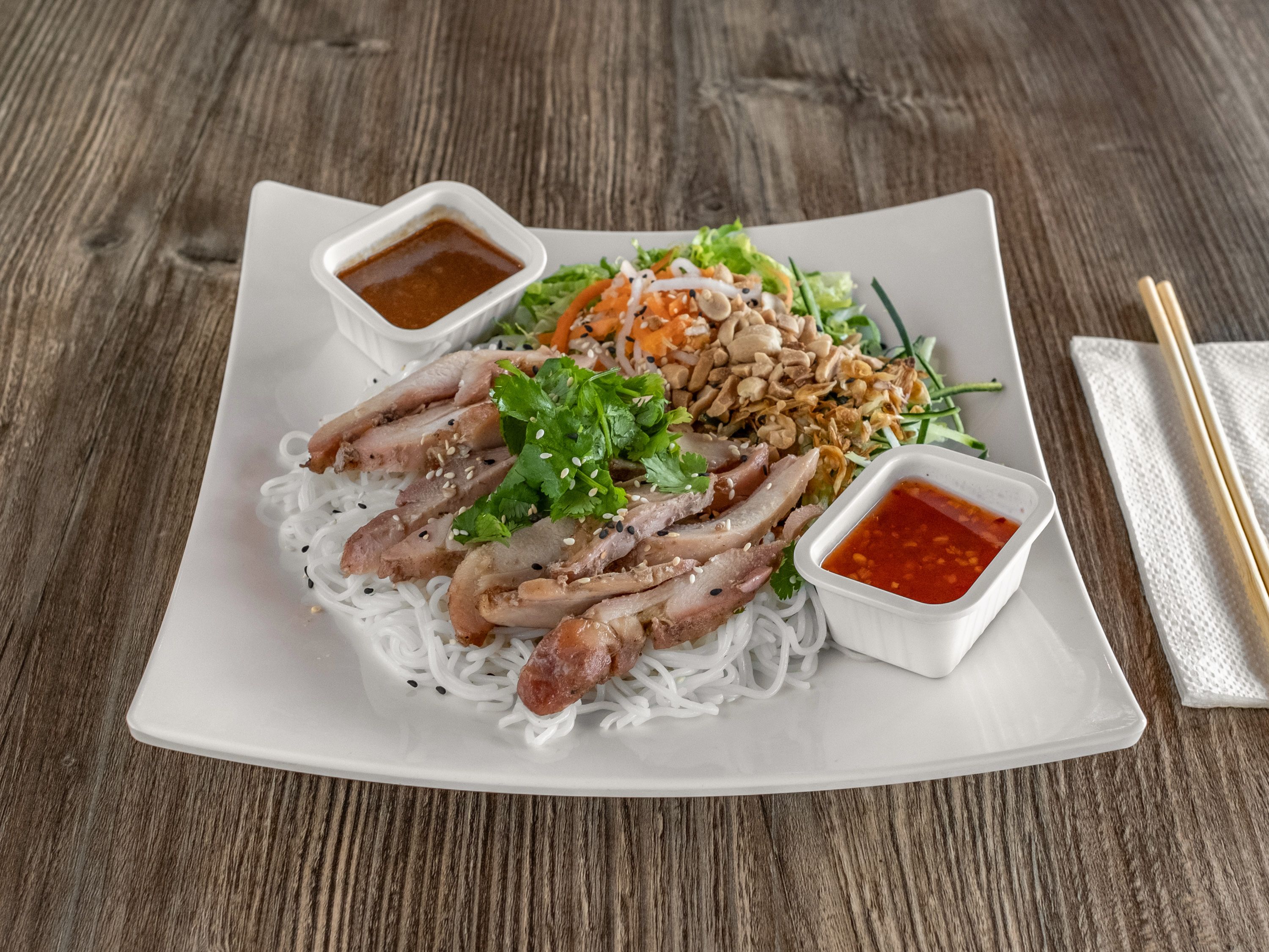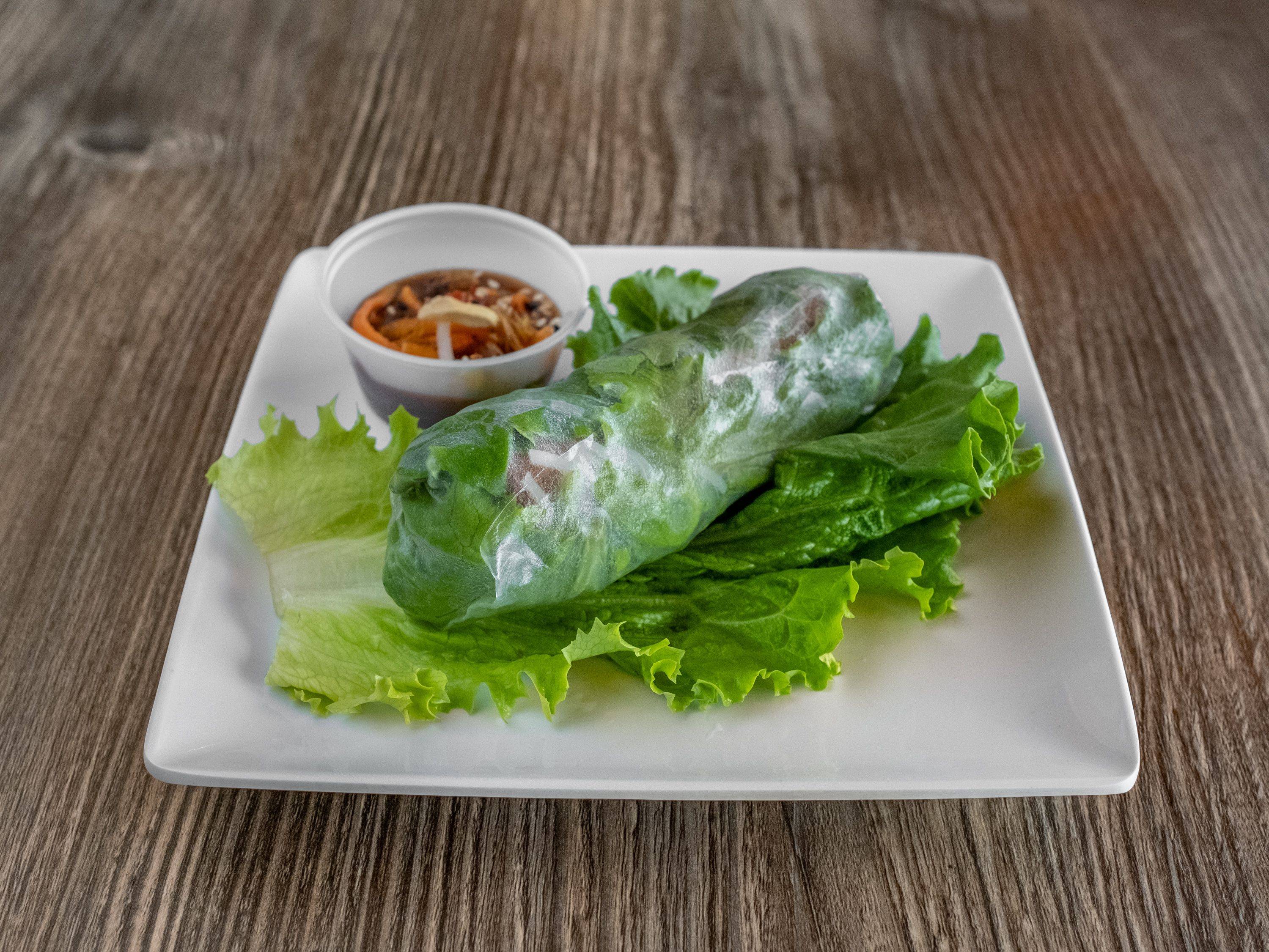 Base: Crispy Crepes, Cucumber, Lettuce, Mint, Cilantro, and serve with Coconut Sauce Main Ingredient: Shrimp