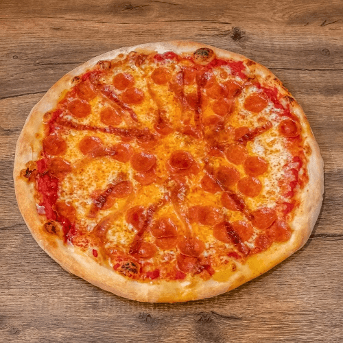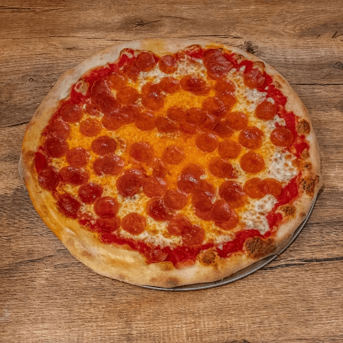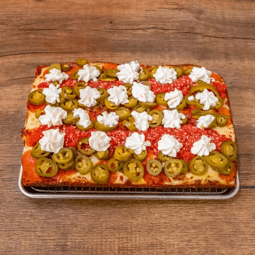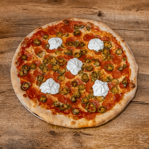 Tomato sauce, mozzarella, pepperoni, ricotta, jalapenos