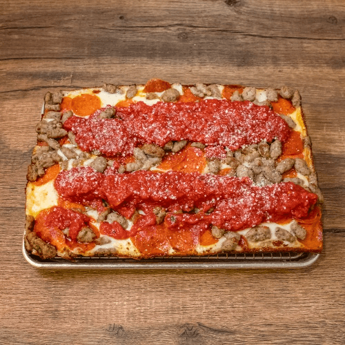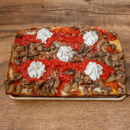 Tomato sauce, mozzarella, pepperoni, Italian sausage, mushrooms, ricotta