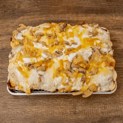 Garlic Butter / Mozzarella / Wisconsin Brick Cheese / White Cheddar / Mushrooms / Caramelized Onions / Ricotta / Parmesan