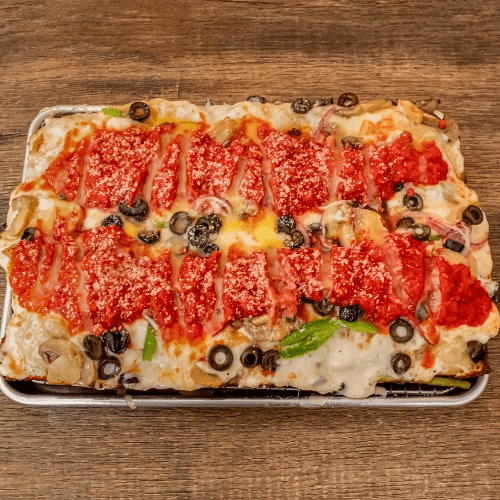 Tomato Sauce / Mozzarella / Wisconsin Brick Cheese / White Cheddar / Bell Peppers / Mushrooms / Onion / Black Olives