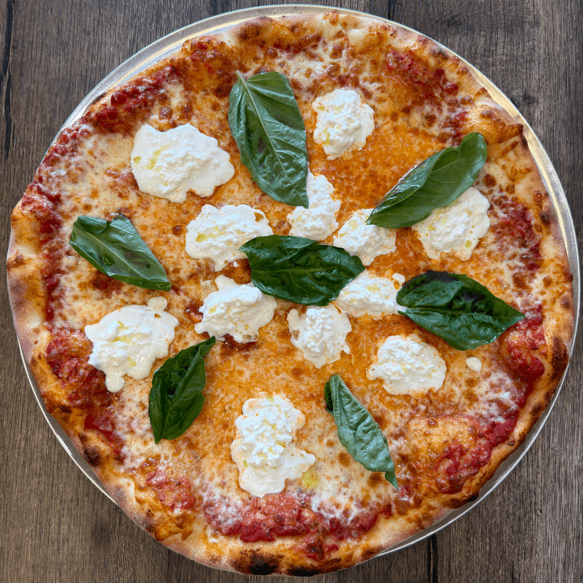 Tomato Sauce, Mozzarella, Burrata, Basil, Olive Oil
