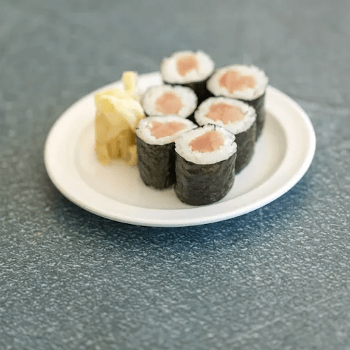 6 pcs of fresh tuna sashimi over sushi rice. Served with rice & salad.