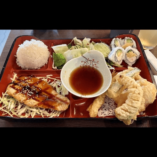 Grilled salmon with teriyaki sauce. Served with rice, salad, tempura, & 4 piece California roll.