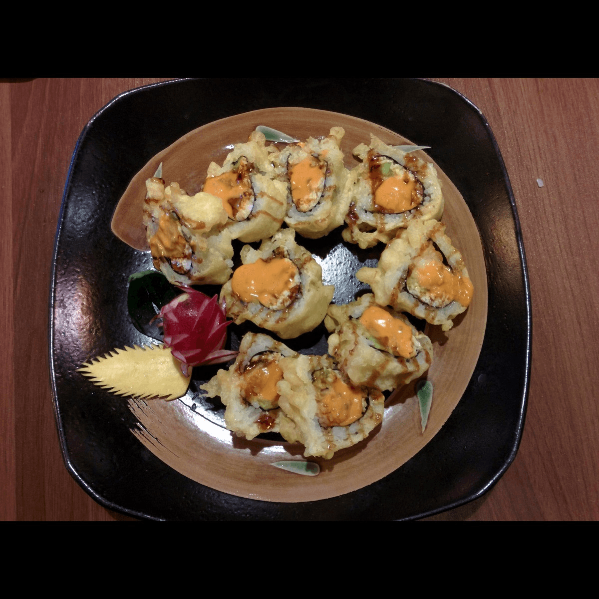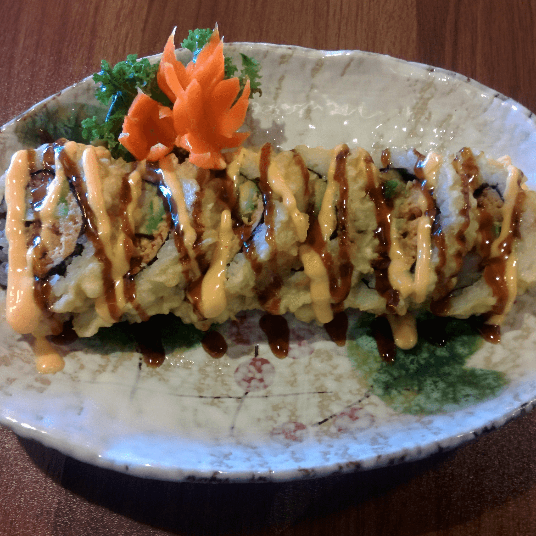Shrimp temp, eel, spicy tuna, & avo roll, then deep-fried & topped with eel sauce & spicy mayo
