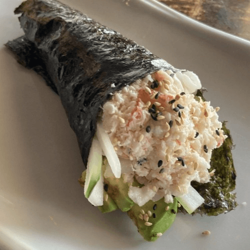 Imitation crab, avo, & spicy tuna roll topped with salmon, tuna, yellowtail, & soy mustard sauce (no rice)