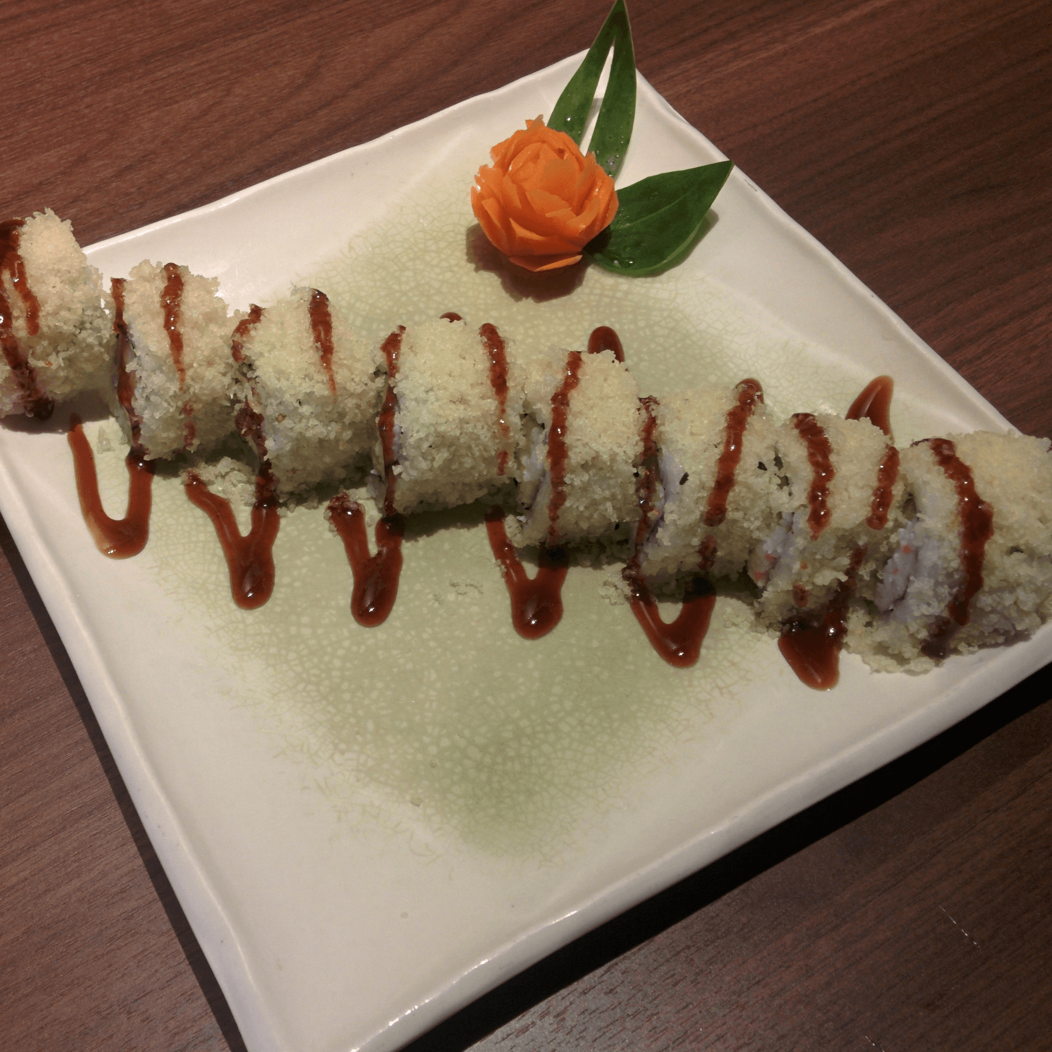 Shrimp temp, imitation crab, avo, & cucumber roll topped with tempura crunch & eel sauce