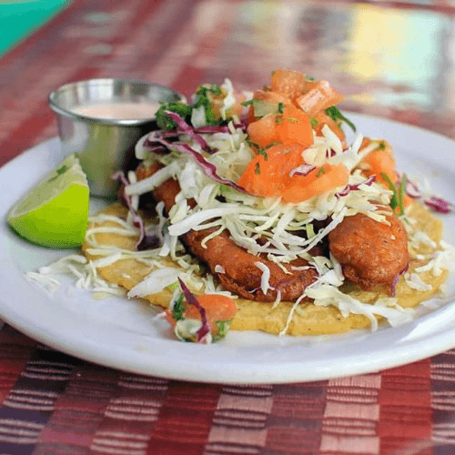 Homemade Corn Masa Shell Topped with Shredded Lettuce, Cotija Cheese and Mexican Crema. Choice of: Shredded Chicken, Shredded Beef, Carne Asada, or Veggie (Cactus,Mushroom, and Potatoe)