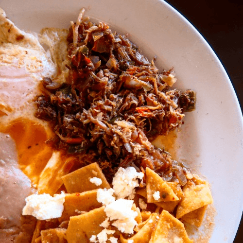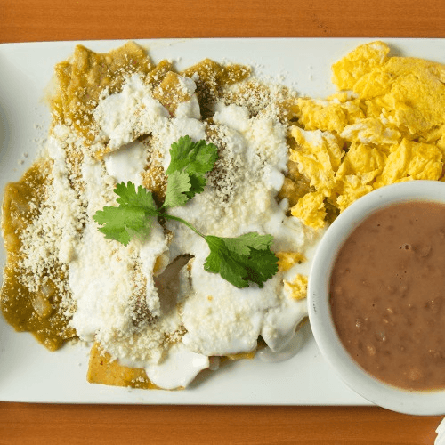 Crispy fried tortillas sauteed with onion. Choice of Green Or Red Salsa. Topped with Mexican crema and cotija cheese. Accompanied by beans. Add 2 Eggs + $3/ Add Grilled Chicken +$5/ Add Carne Asada +$5. *Available until 2:00pm.
