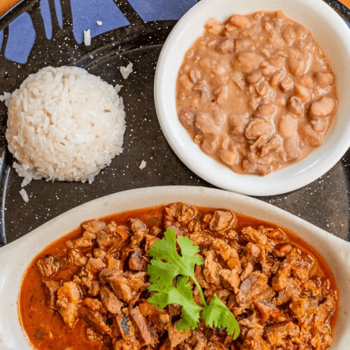 Diced steak sautéed with onions, cilantro, tomatoes, jalapeños, and garlic in a light ranchero sauce. Served with rice, beans, and tortillas