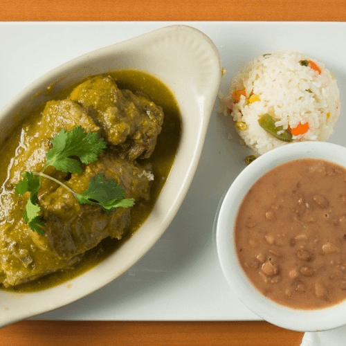 Choice: Red or Green. Choice of Protein: chicken breast, shredded chicken, or bone-in leg and thigh. Served with rice, beans, and handmade corn tortillas.