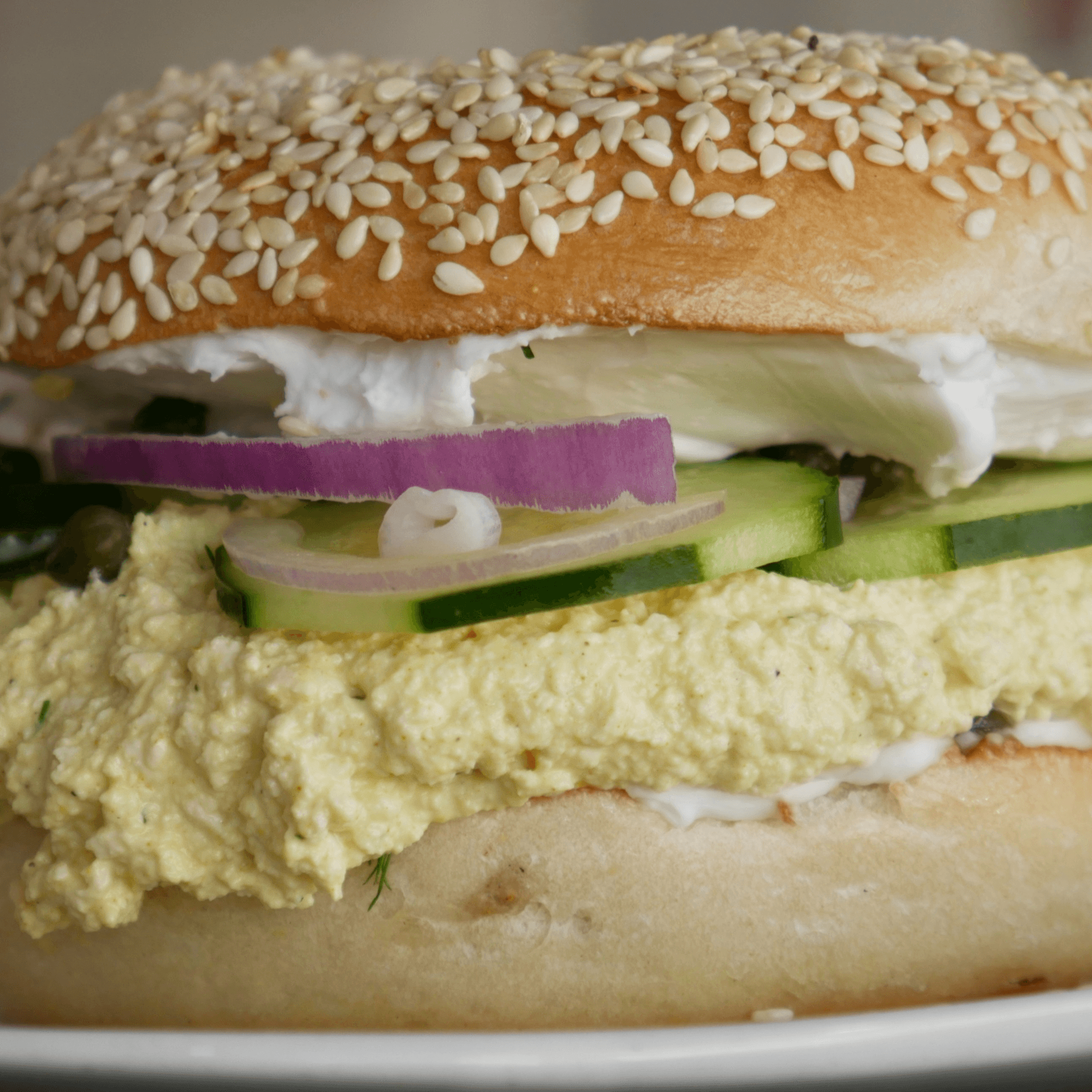 Plant based cream cheese, egg salad, cucumber, red onion, capers
