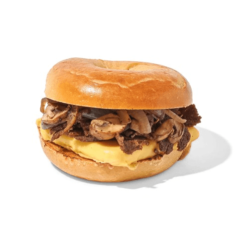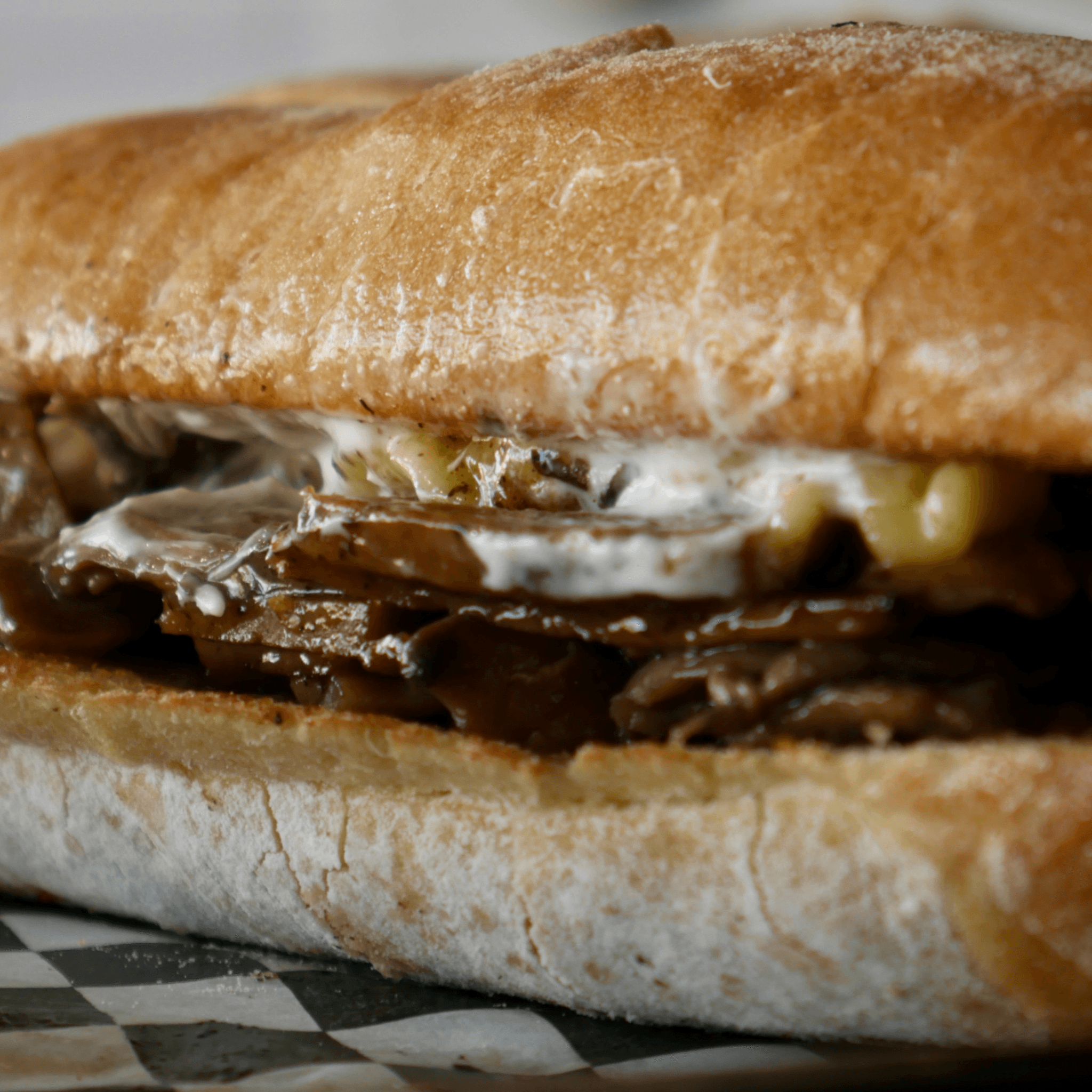 Plant based steak, Swiss, grilled mushrooms, grilled onions, horseradish aioli