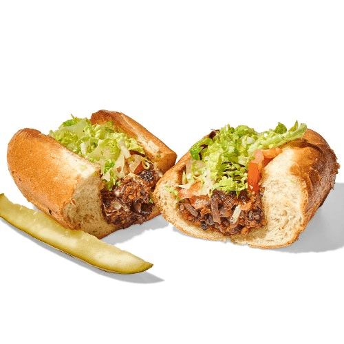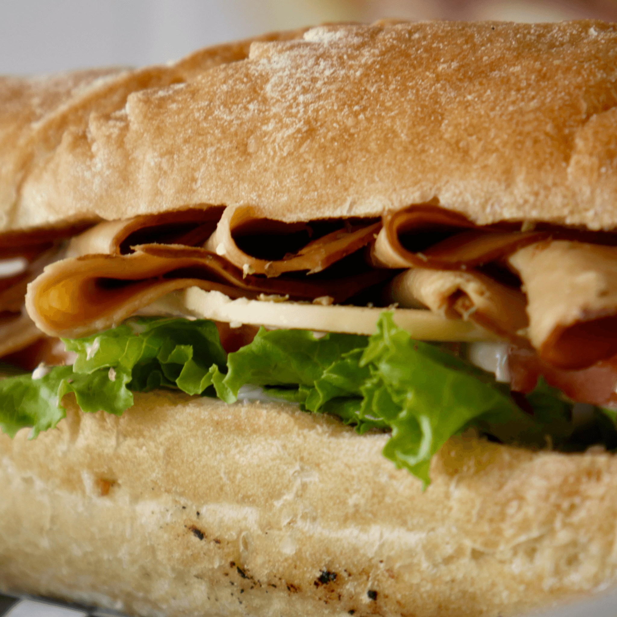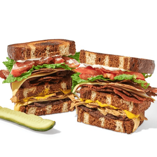Plant based corned beef, turkey, steak, bacon, Swiss, lettuce, tomato, red onion, mayo, deli mustard. Allergens: Soy, Gluten