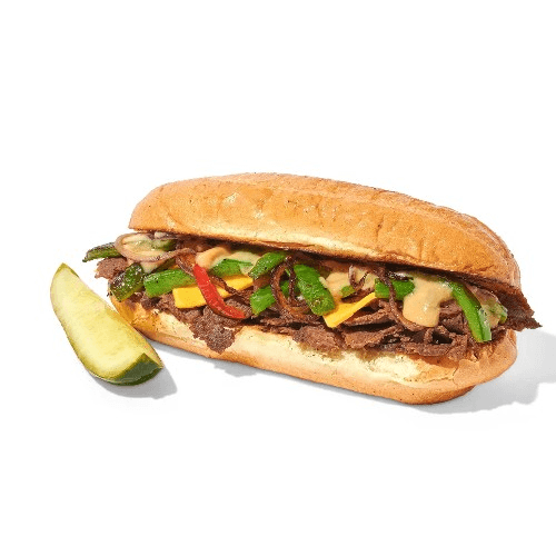 Plant based steak, house cheese sauce, grilled peppers and onions
