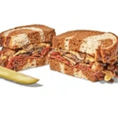 Plant based corned beef, Swiss, grilled onions, deli mustard; Allergens: Soy, Gluten
