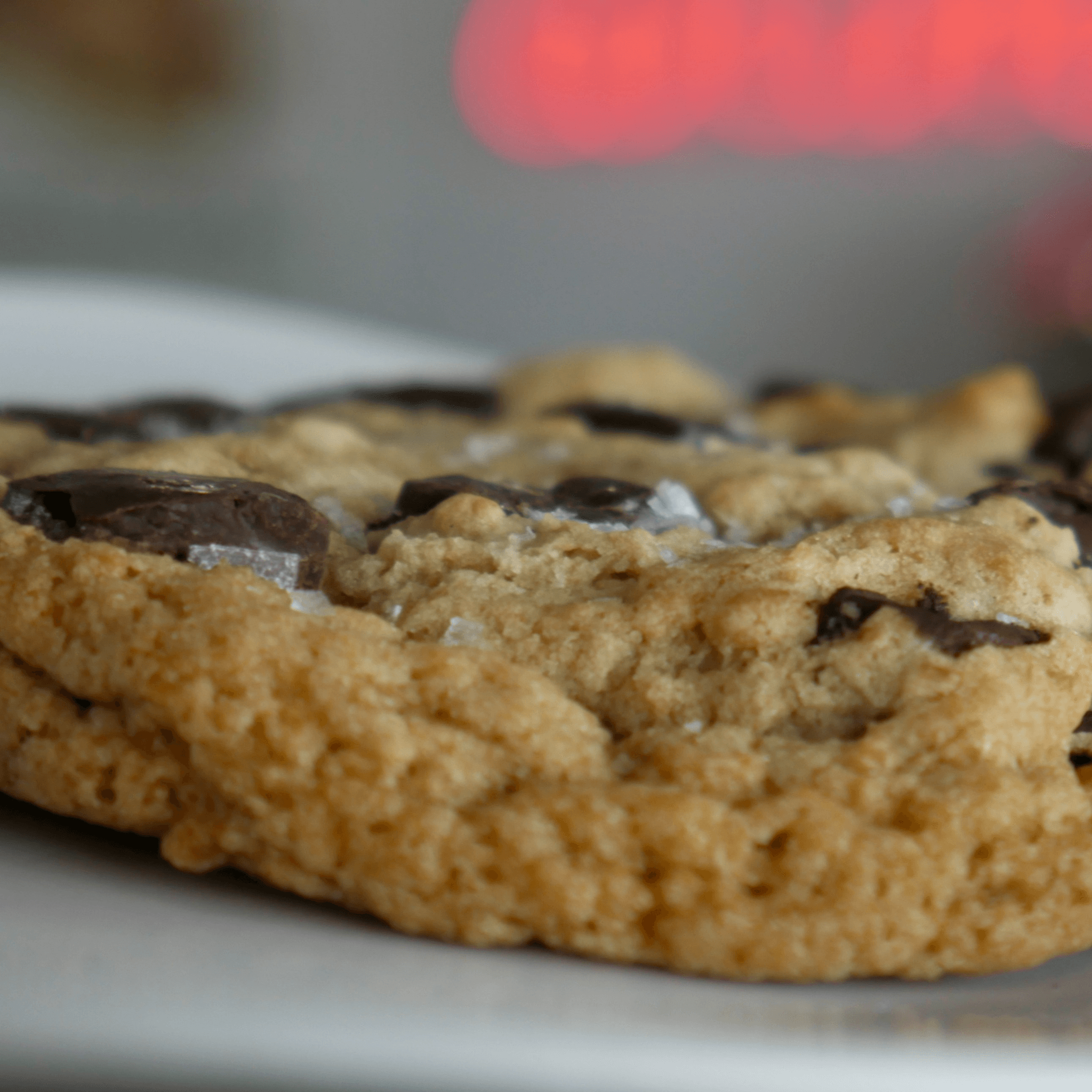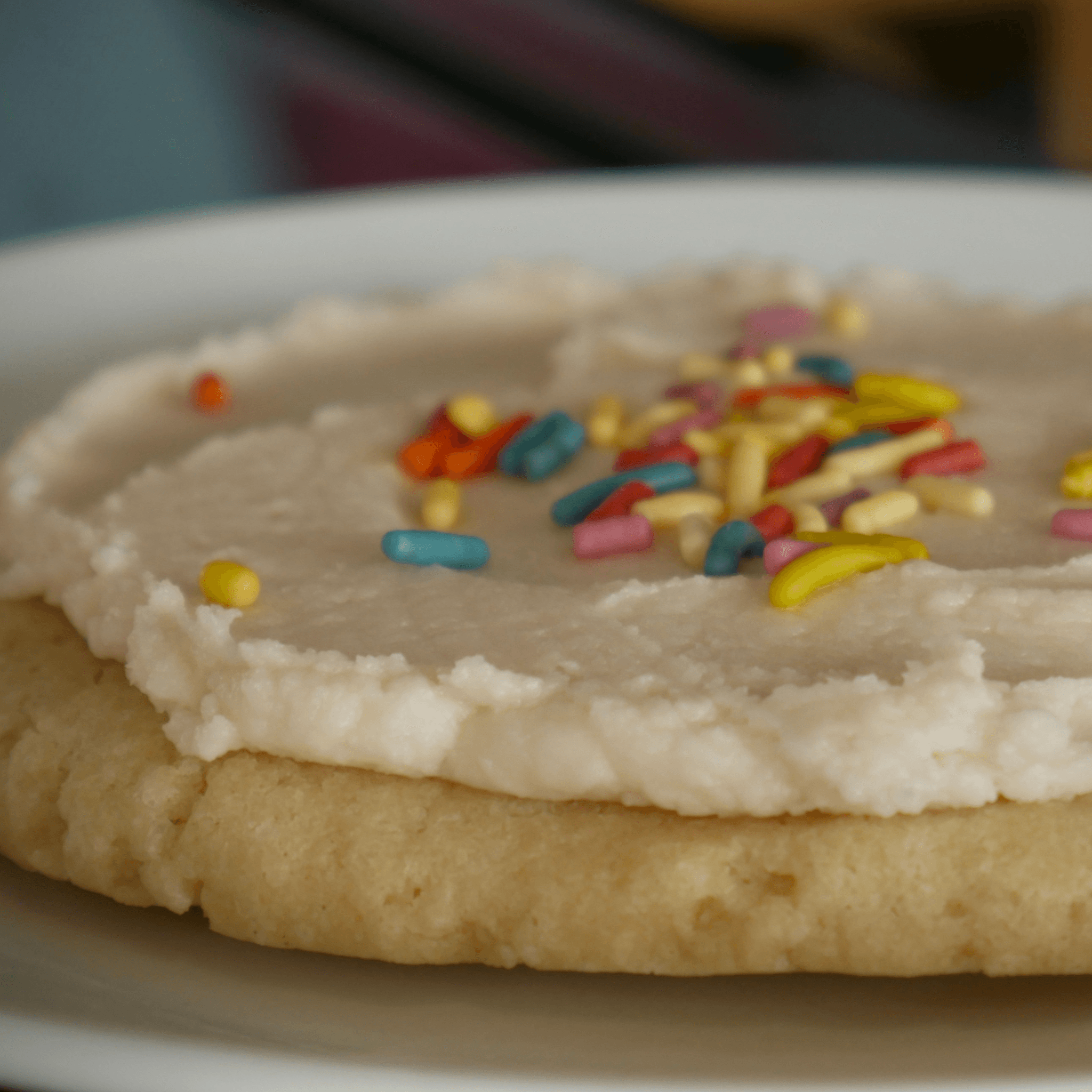 vegan frosted cookie, topped with sprinkles. (Vanilla frosting *green for March*)