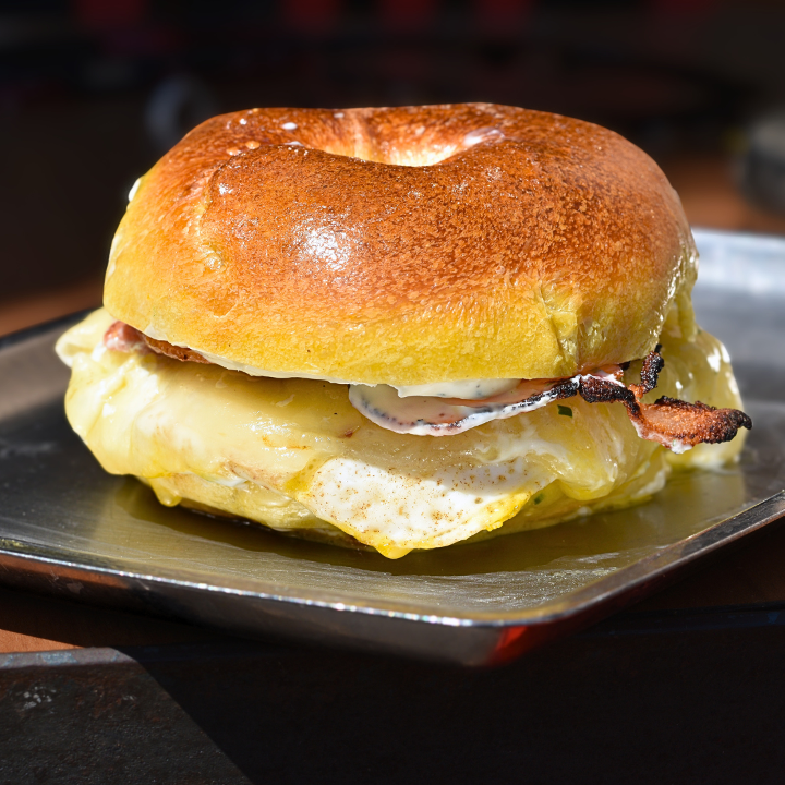 Exclusive Marigold egg bagel (Only available at TCS), TCS chicken bacon, over-easy egg, white cheddar, whipped chive & lemon cream cheese