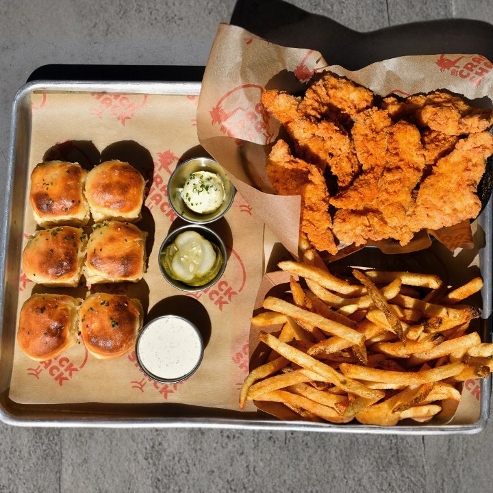 12 tenders, 6 biscuits, large hand cut fries, honey chive butter, dill pickles, ranch