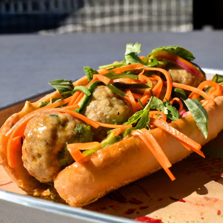 Banh mi meatballs, pickled veggies, garlic chili-lime mayo, thai herbs, amoroso roll