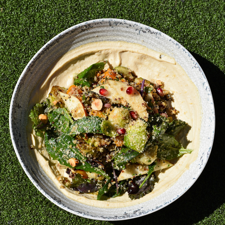 red d’anjou pear, butternut squash, brussels sprouts, pickled cranberries, pomegranate, hazelnuts, baby kale, quinoa, hummus, brown butter-shallot vinaigrette