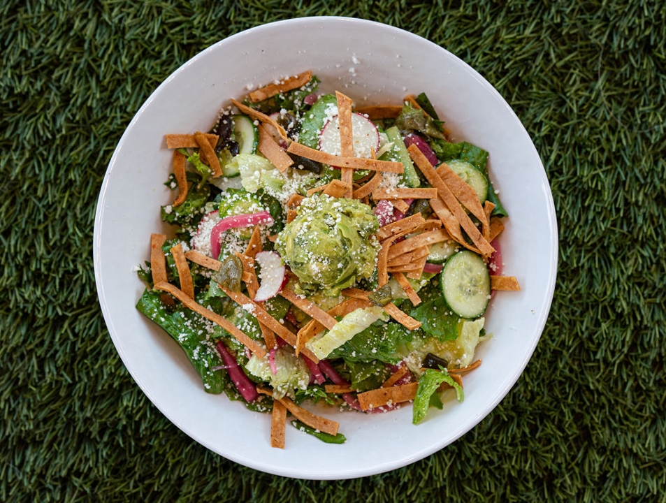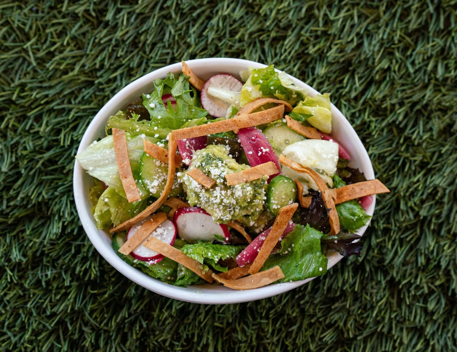 cucumbers, guac, radishes, pickled onions, cilantro, cotija cheese, tortilla strips, charred poblano dressing