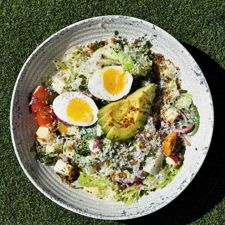mixed lettuces, fuji apple, pickled red onions, heirloom tomatoes, crispy quinoa, aged cheddar, soft boiled egg, avocado, herby buttermilk ranch
