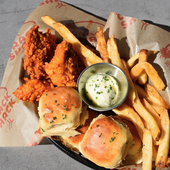 3 fire-tossed tenders, 4 biscuits, hand cut fries, honey chive butter, fountain drink