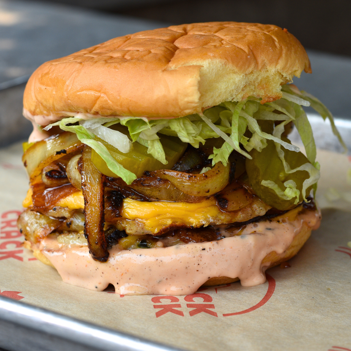 two chicken patties, crispy bacon, griddled mustardy onions, american cheese, b&b pickles, savory sauce, shredded iceberg, potato bun