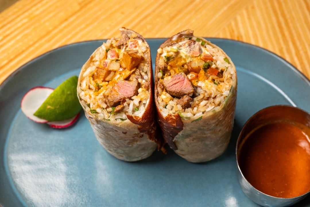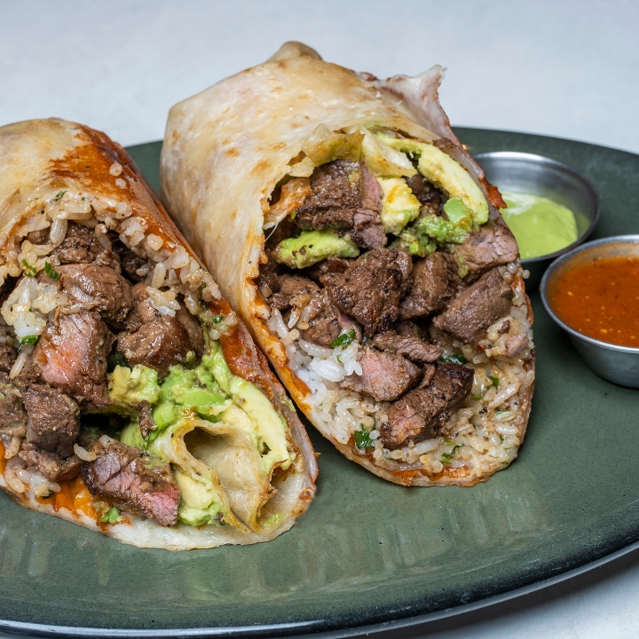 Flour tortilla, crispy melted cheese, marinated filet mignon, herb lime rice, and avocado served with a side of jalisco salsa and spicy pistachio serrano salsa.