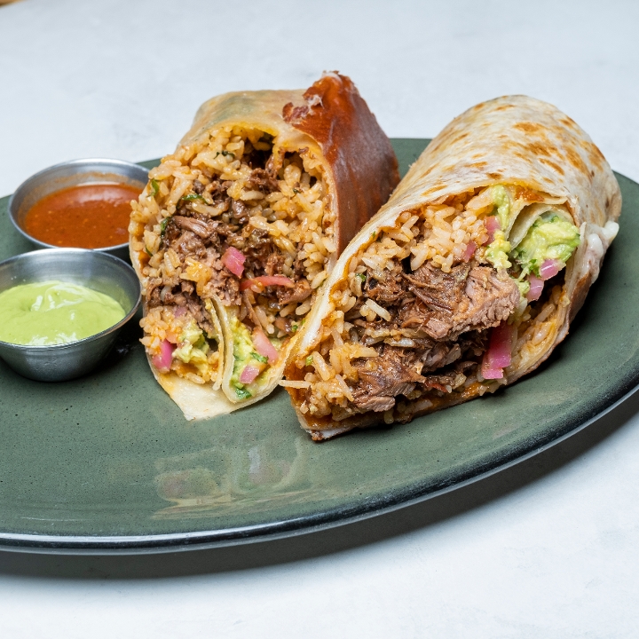 Flour tortilla, crispy melted cheese, braised short rib, jalisco salsa, herb lime rice, pickled onions, and avocado. Served with a side of side jalisco salsa and avocado tomatillo salsa.