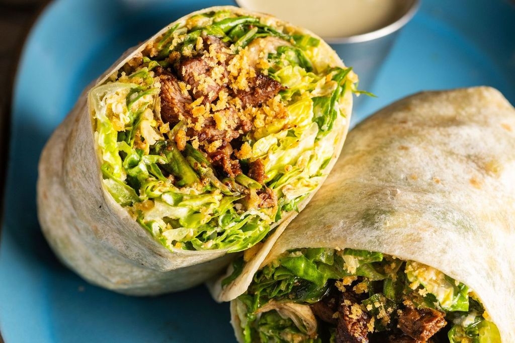 Flour tortilla, chicken, little gem, breadcrumbs, Parmigiano-Reggiano, jalapeño slices.
