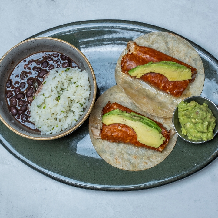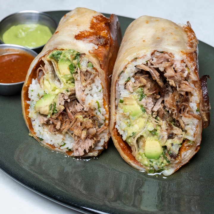 Flour tortilla, crispy melted cheese, traditionally braised pork, herb lime rice, and guacamole. Served with a side of jalisco salsa and avocado tomatillo salsa.