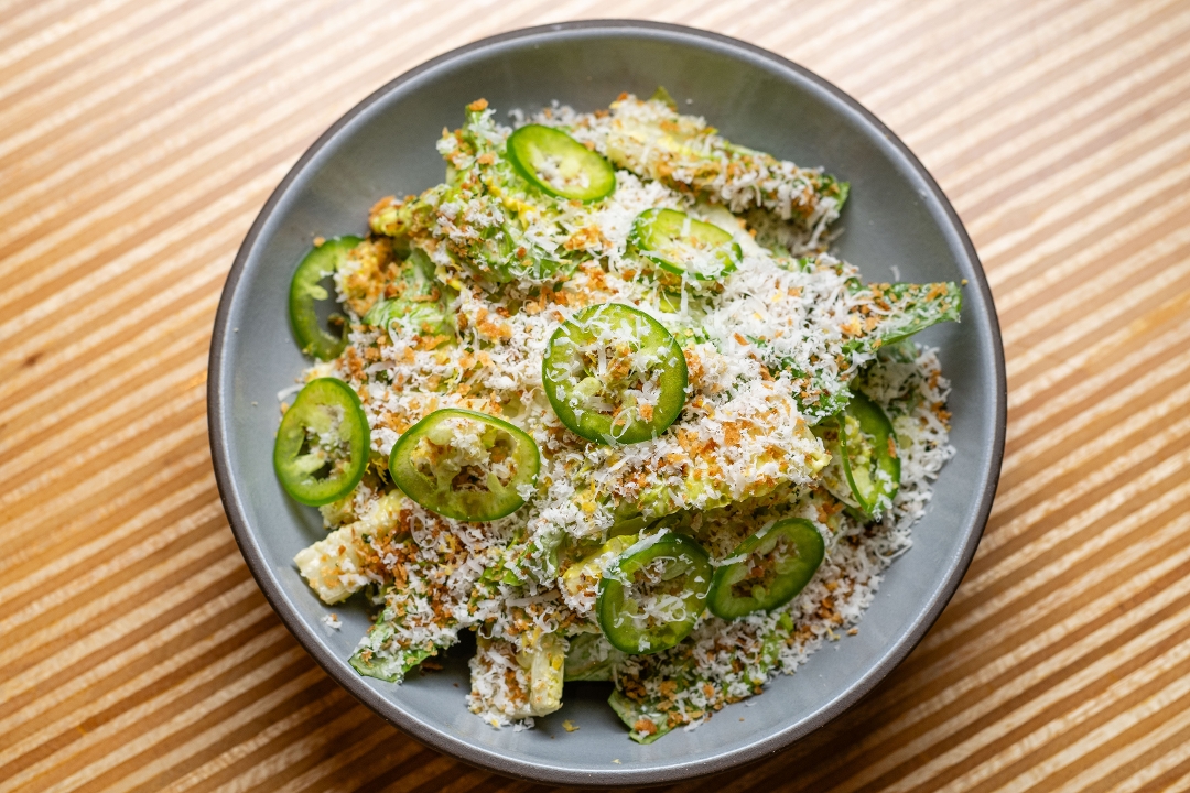 little gem, breadcrumbs, Parmigiano-Reggiano, jalapeño slices