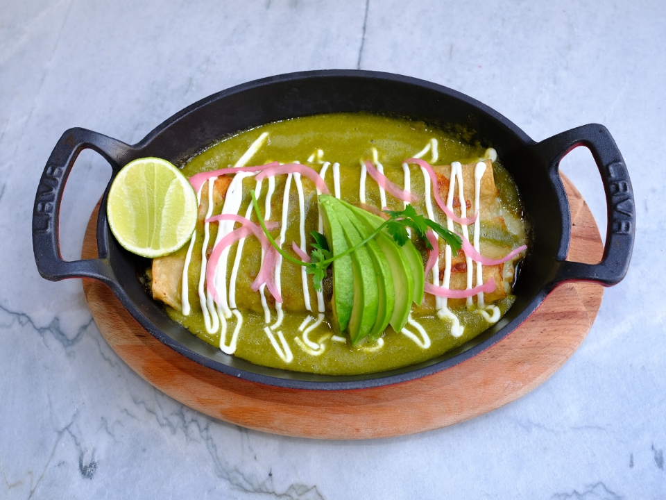 free range Jidori chicken, chile verde sauce, Queso Oaxaca, Mexican cream, pickled red onion, avocado