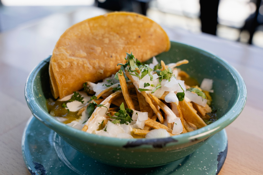 JUST EGG* , SERVED IN A BOWL WITH SALSA VERDE, TOPPED WITH CRUNCHY TORTILLA STRIPS ,CREMA, ONIONS & CILANTRO. SERVED WITH A SIDE OF CORN TORTILLAS.