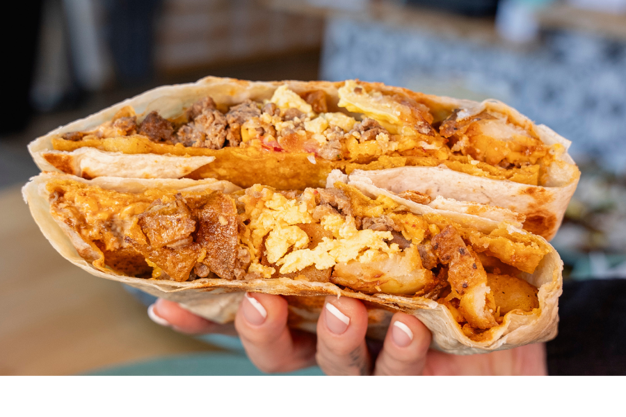 JUST* Egg, Chili mayo, Pico de gallo, Morita salsa, Breakfast sausage, Seasoned potatoes, covered with a crunchy tostada. All of this wrapped on a 12" flour tortilla, then slowly grilled on the flat top for that extra crispy texture.