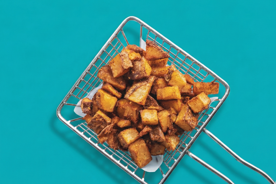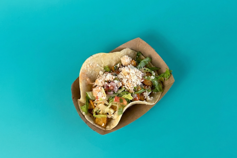 Single taco with seasoned breakfast potatoes, chili mayo, lettuce and pico, on a flour tortilla