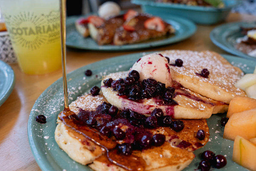 Stack of 3 with Mama's Blueberry Gravy, Maple Syrup, Fruit