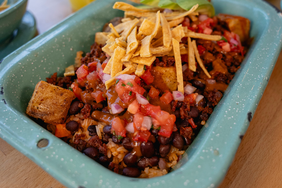 Mexican Rice, Black Beans, Potatoes, Pico, Avocado, Tortilla Strips