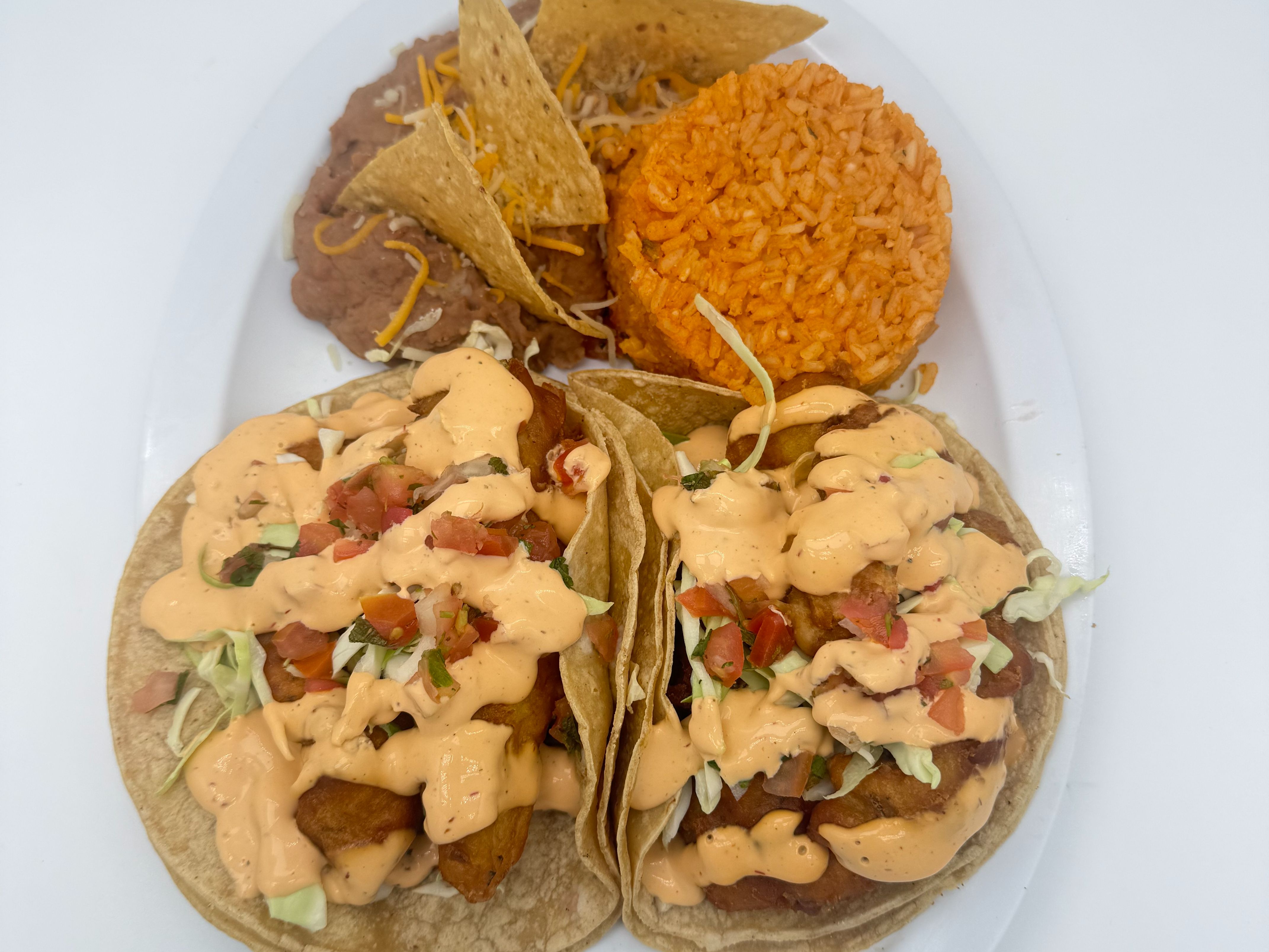 2 breaded Fish tacos with Pico de gallo, lettuce and chipotle sauce with rice and beans on the side