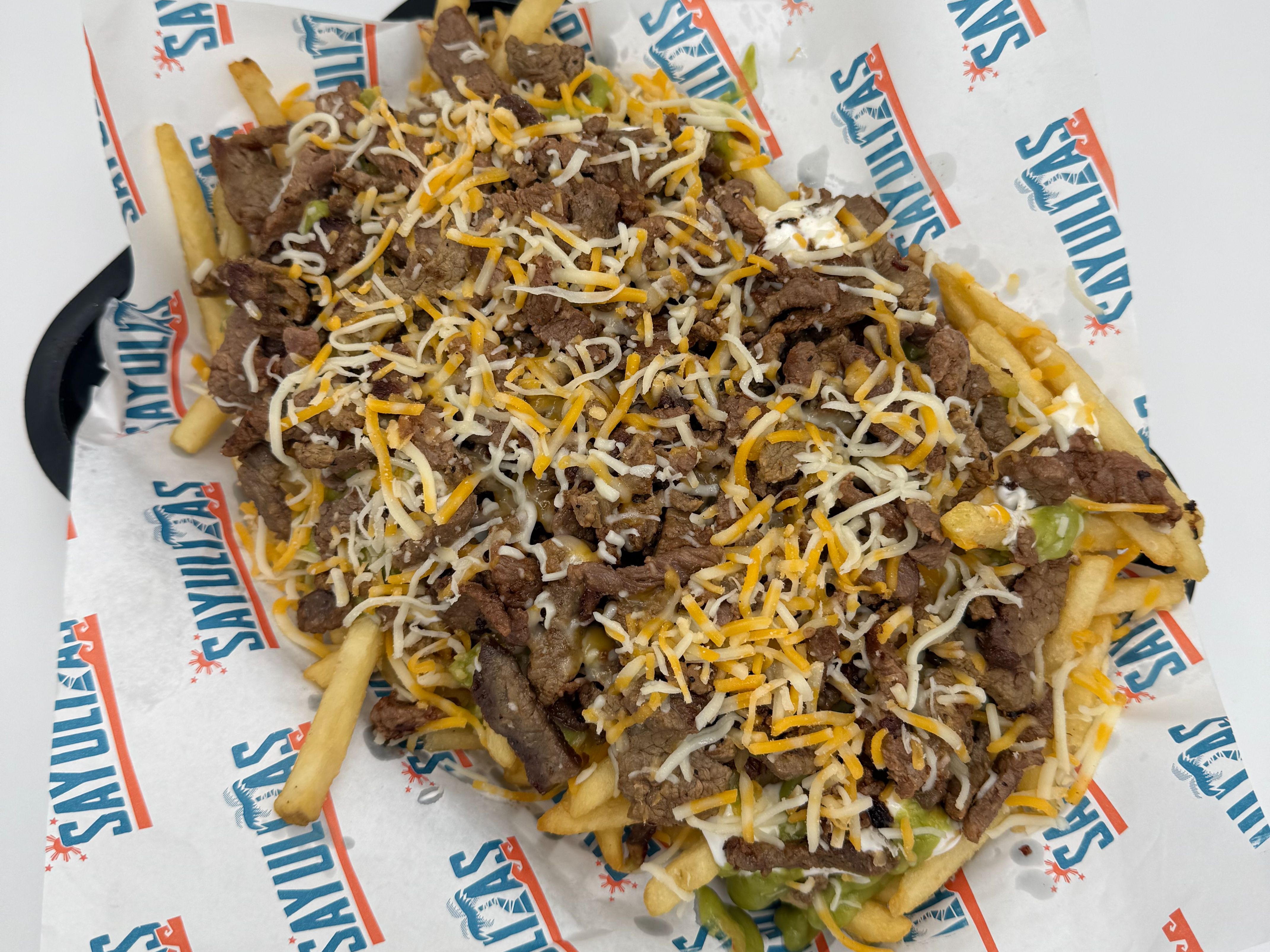 Carne asada, spam, Guacamole, Sour cream, cheese & fries