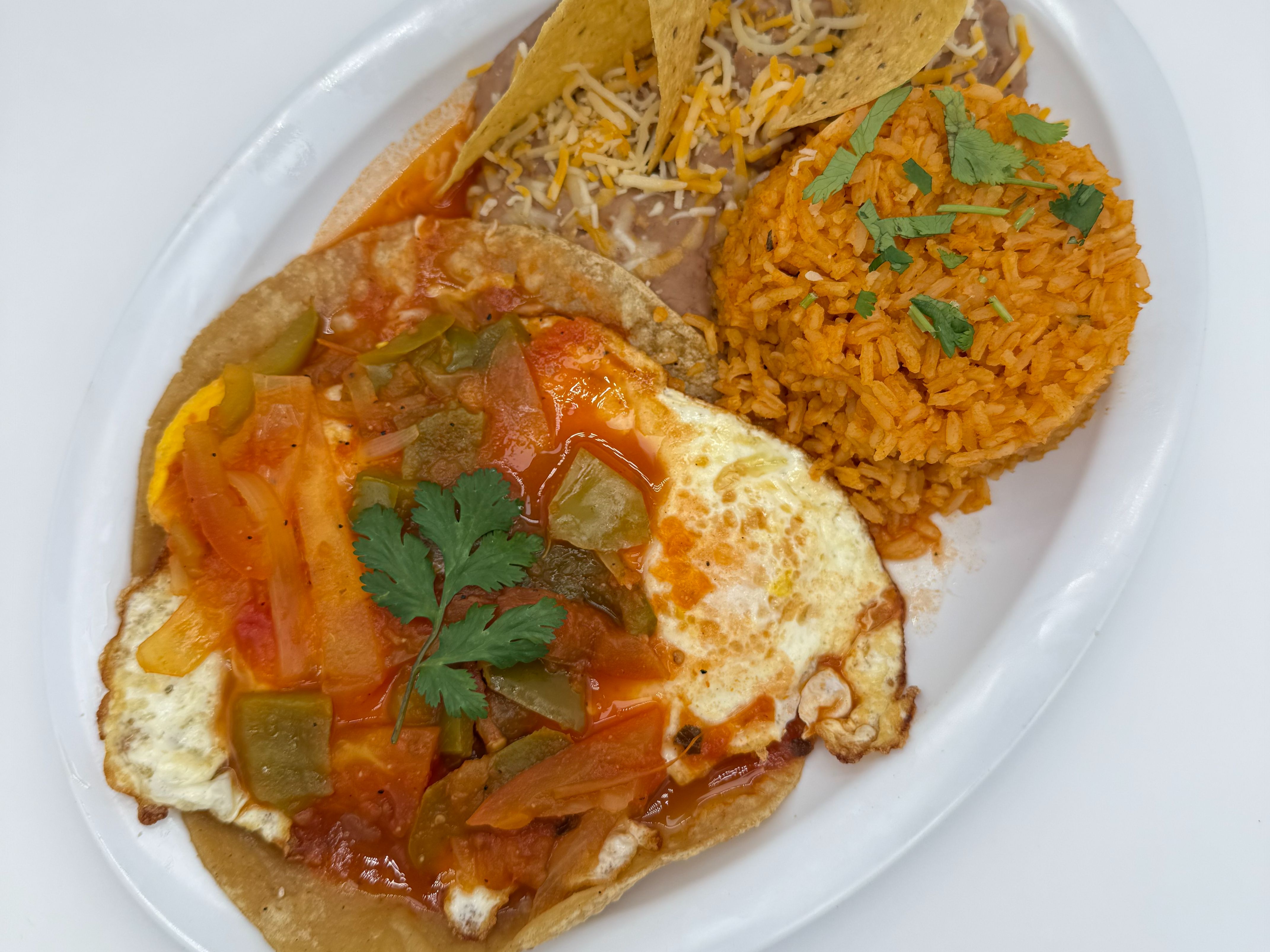 tortillas chips with our delicious house salsas topped with cilantro, onions, sour cream, cotija cheese & 2 fries eggs with rice and beans on the side