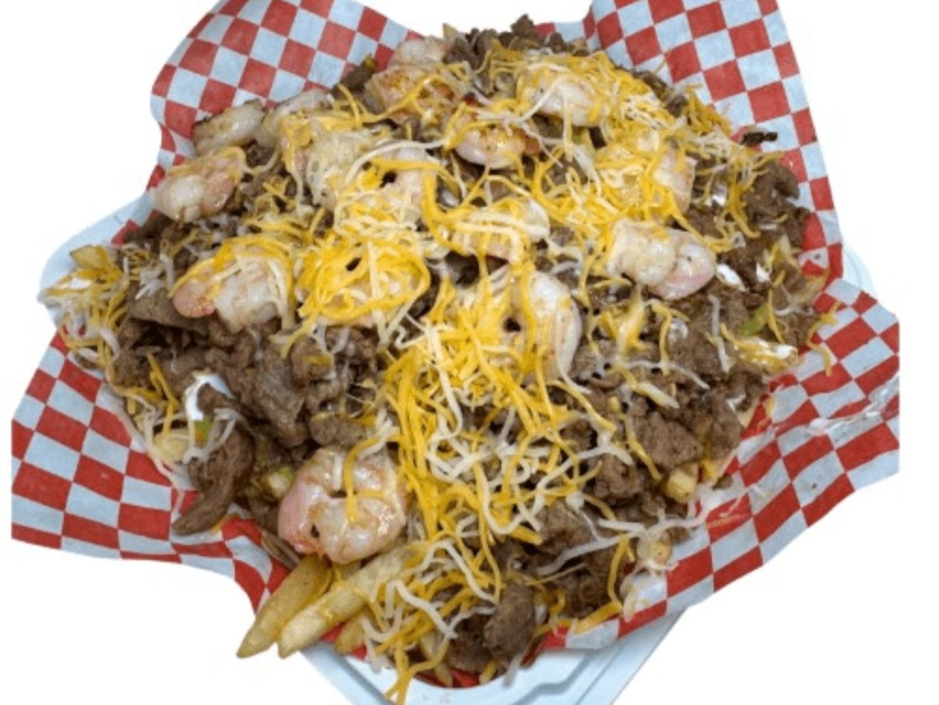 carne asada, shrimps, beans, sour cream, guacamole & cheese