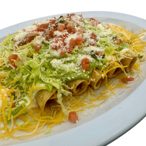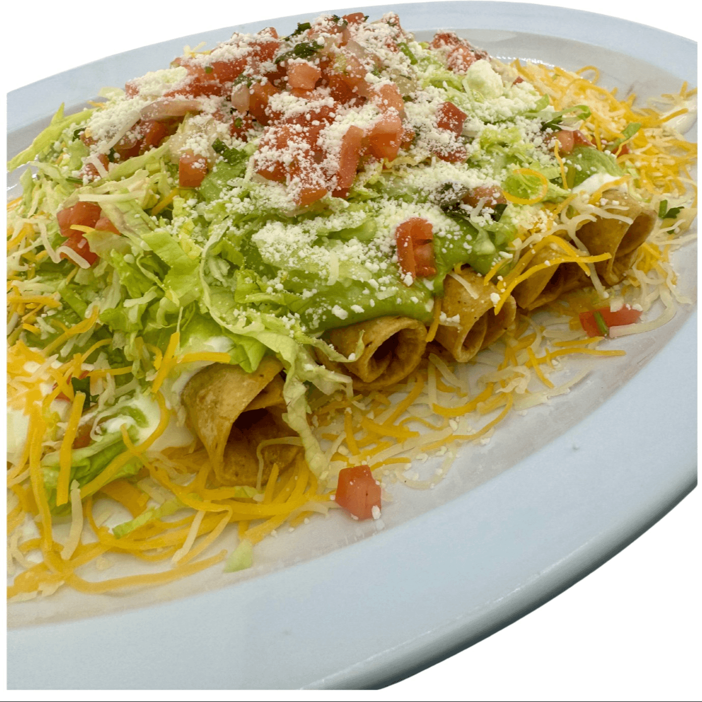 5 roll tacos with guacamole, sour cream, pico de gallo, lettuce & cheese