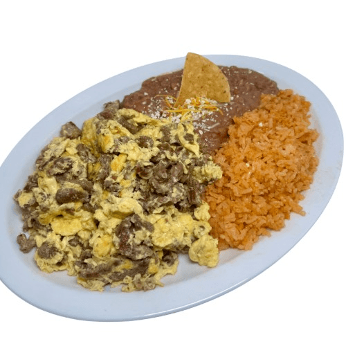 eggs mixed with beef, bell peppers & onions with rice and beans on the side accompanied with choice of flour or corn tortillas