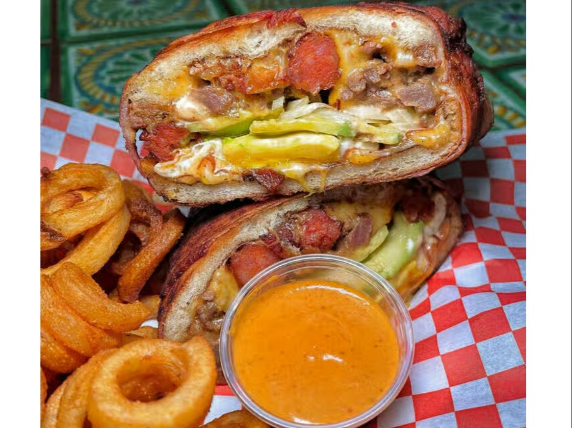 Mexican sandwich with Longanisa, Carne Asada, Onions, Avocado, Chipotle sauce, cheese and a Fried egg