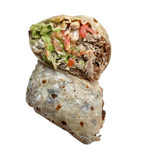 Two doubled wrapped tortillas filled with carne asada, al pastor, rice, pollo asado, carnitas, sour cream, gyros & guacamole