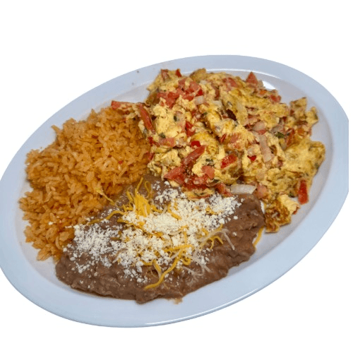 eggs mixed with pico de gallo with rice and beans on the side accompanied with choice of flour or corn tortillas